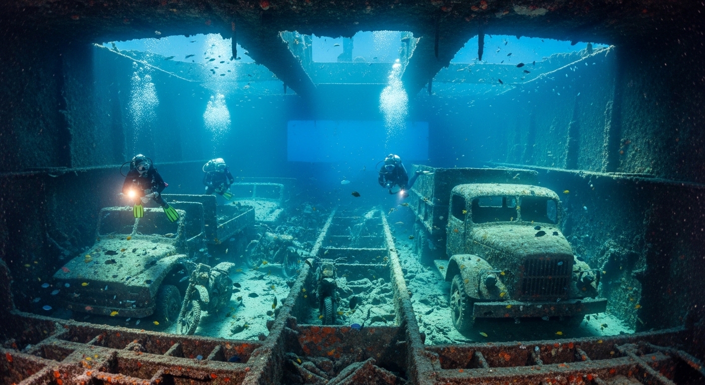 Das Innere des Thistlegorm ist ein Zeitreisegefühl der besonderen Art. In den Frachträumen stehen noch immer BSA-Motorräder, Bren-Carrier-Fahrzeuge, Lastkraftwagen, Munitionskisten und sogar zwei Dampflokomotiven, die durch die Explosion aus dem Schiff geschleudert wurden und nun neben dem Wrack liegen. Uniformen, Stiefel und persönliche Gegenstände der Besatzung sind ebenfalls erhalten – als wären Zeit und Salz des Meeres Komplizen im Konservieren dieser Geschichte.